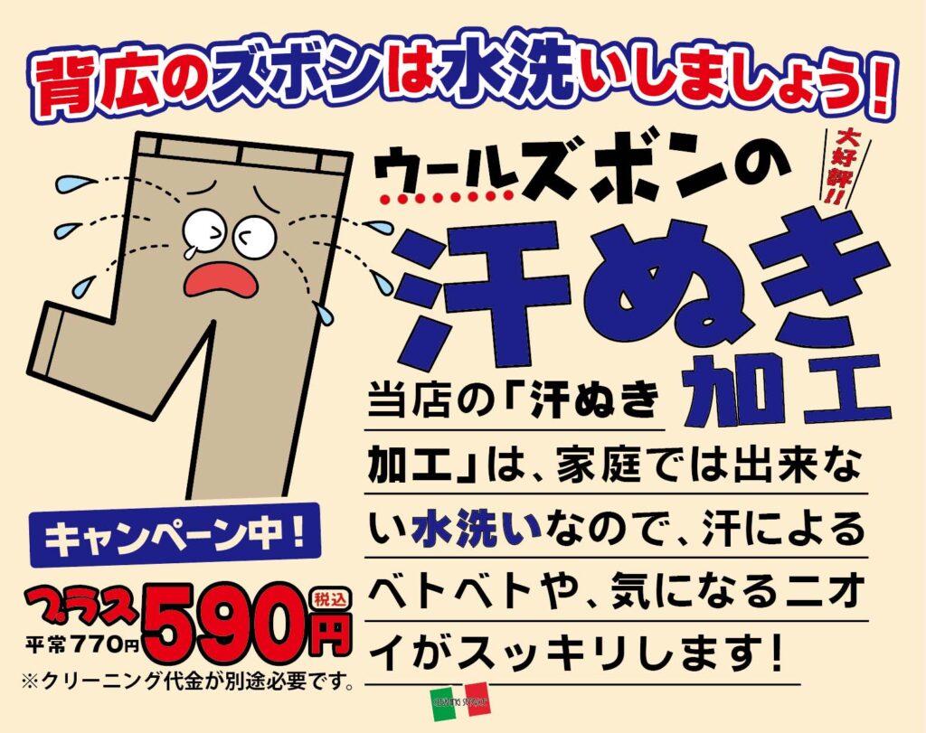 ウールズボンの汗抜き加工(プロの水洗い)キャペーン中 590円